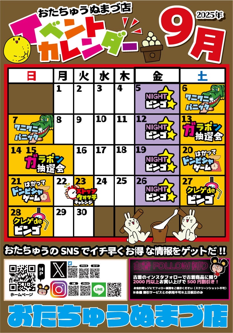 9月のイベントカレンダーができました! 2025年9月1日 2025年11月21日 おたちゅう沼津店、9月のイベントカレンダーができました! イベント詳細はホームページもご確認ください。 otakara-numazu.com **************** その他買取情報はこちら! イベント情報はこちら!