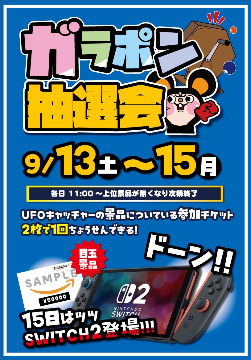 9月13日(土)〜15日(月) ガラポン抽選会開催! 2025年9月10日 2025年9月16日 【イベント】 ガラポン抽選会 9月13日(土)〜15日(月)開催! UFOキャッチャーの景品に付いているガラポン抽選券2枚で1回挑戦できます! 各日 11時〜上位賞がなくなり次第終了です。 なんと!!15日(月)の金賞にはSwitch2登場!! **************** その他買取情報はこちら! イベント情報はこちら!