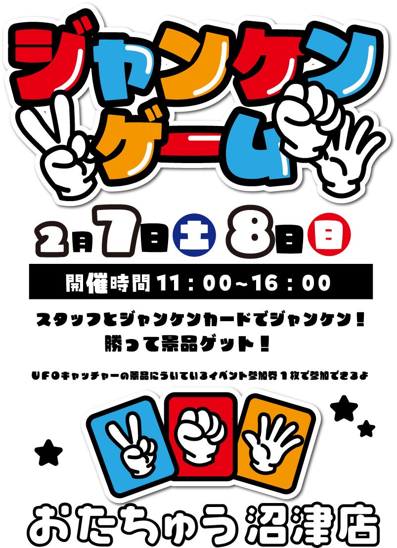 ★《2月7日・8日》ジャンケンゲーム★ 2026年2月5日 【イベント】 ジャンケンゲーム 2月7日(土)、8日(日) 11時〜16時開催 UFOキャッチャーの景品についているイベント参加券1枚で参加できるよ! **************** その他買取情報はこちら! イベント情報はこちら!