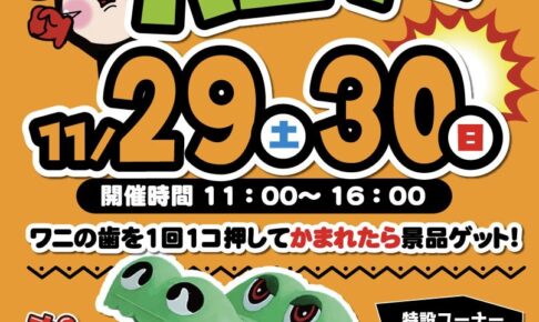 イベント情報【イベント】 11月29日(土)〜30日(日)ワニワニパニック! イベント参加券1枚でチャレンジ! 参加券はUFOキャッチャーの景品についてるよ! ワニの歯を1回押して[かまれたら]景品ゲット! ************…